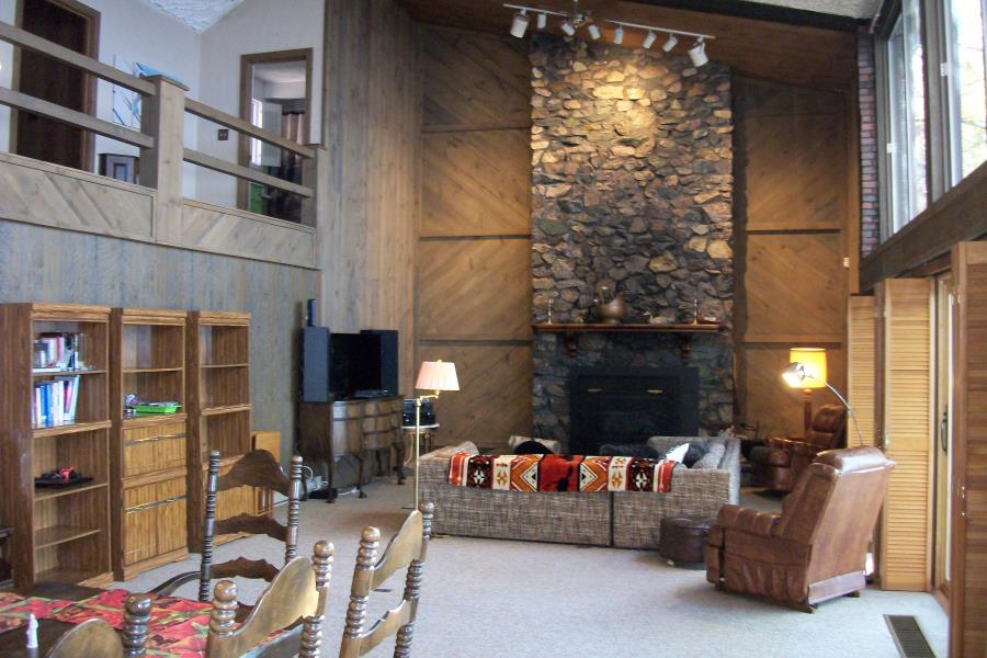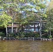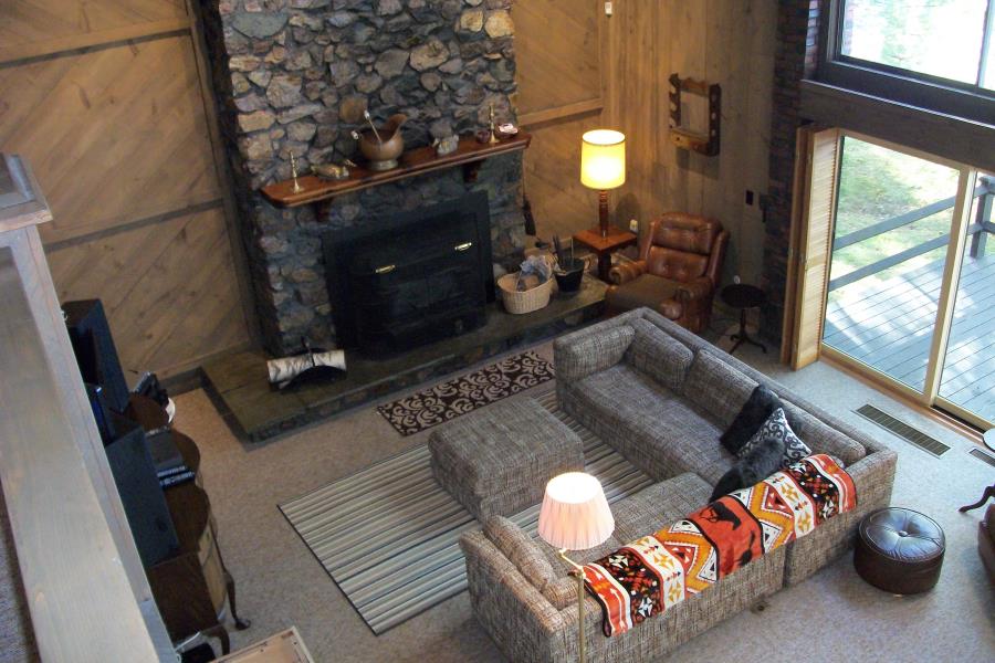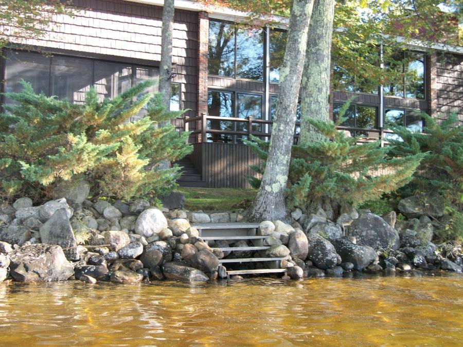 Ossipee Lake House has two stories of windows looking out to the lake. From the balcony outside the upstairs bedrooms we see the great room and kitchen.