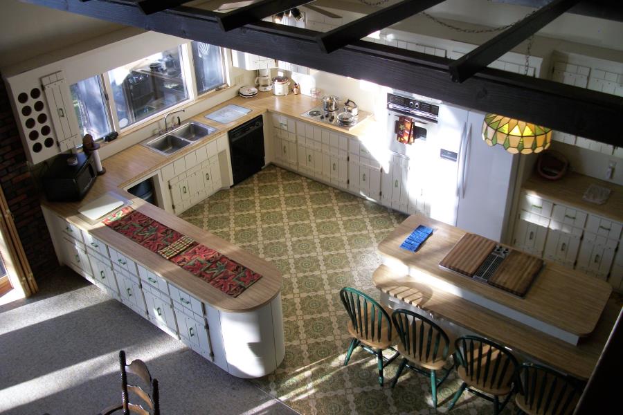 The kitchen from the balcony. The kitchen is fully equipped including dishes, utensils, glasses, wine glasses, pots, pans, casseroles, and serving platters.