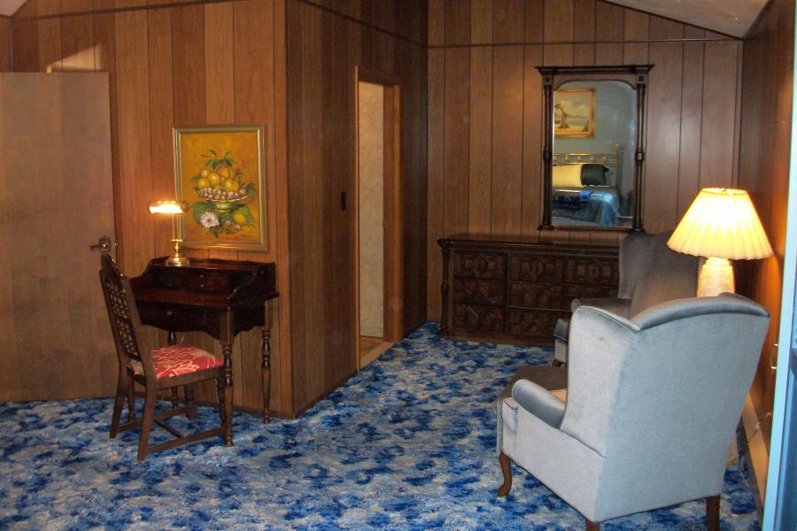 Fieldstone fireplace at the end of the great room has a fireplace insert for convenience and energy conservation.