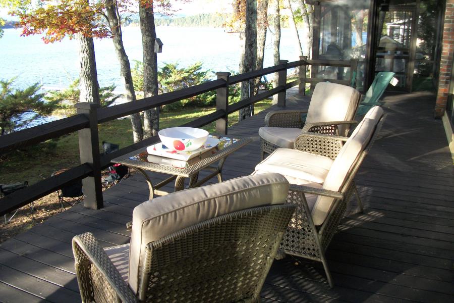 Screened porch overlooks the lake and leads to the deck. Listen to the loons at night while playing games under the light and ceiling fan.