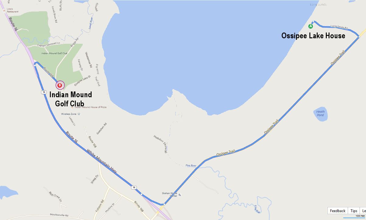 The following map shows the location of Ossipee Lake House and some of the many warm weather recreation highlights of the area. For a map showing all season recreation as well as dining and other activities click here